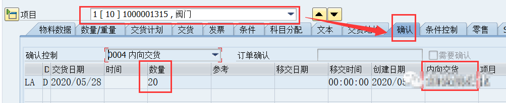 在采購(gòu)訂單閥門物料項(xiàng)目細(xì)節(jié)區(qū)的確認(rèn)卡片中可以看到剛才創(chuàng)建的內(nèi)向交貨單,如下圖。
